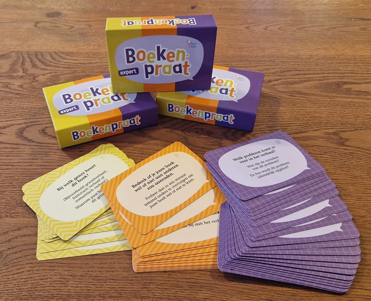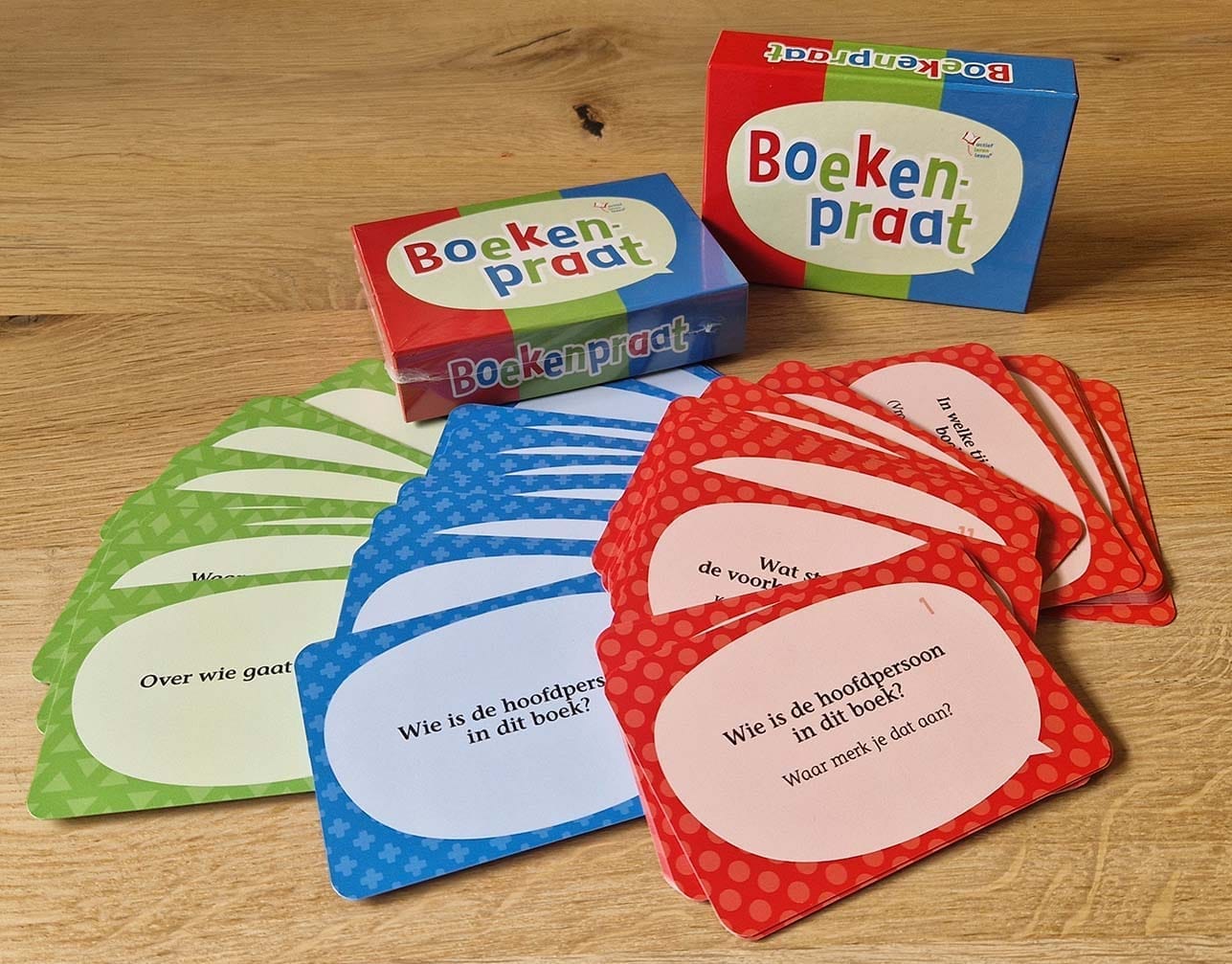 Boekenpraat is ontwikkeld voor de leerlingen van groep 3 t/m 5 en Boekenpraat expert is ontwikkeld voor de leerlingen van groep 6 t/m 8. Met Boekenpraat praten de leerlingen klassikaal, met de leerkracht of onderling over een boek dat ze hebben gelezen. Op elk kaartje staat één hoofdvraag en op sommige kaartjes staan ook vervolgvragen. De leerlingen werken aan hun mondelinge taalvaardigheid en leesmotivatie door hun kennis en mening over boeken met elkaar te delen.